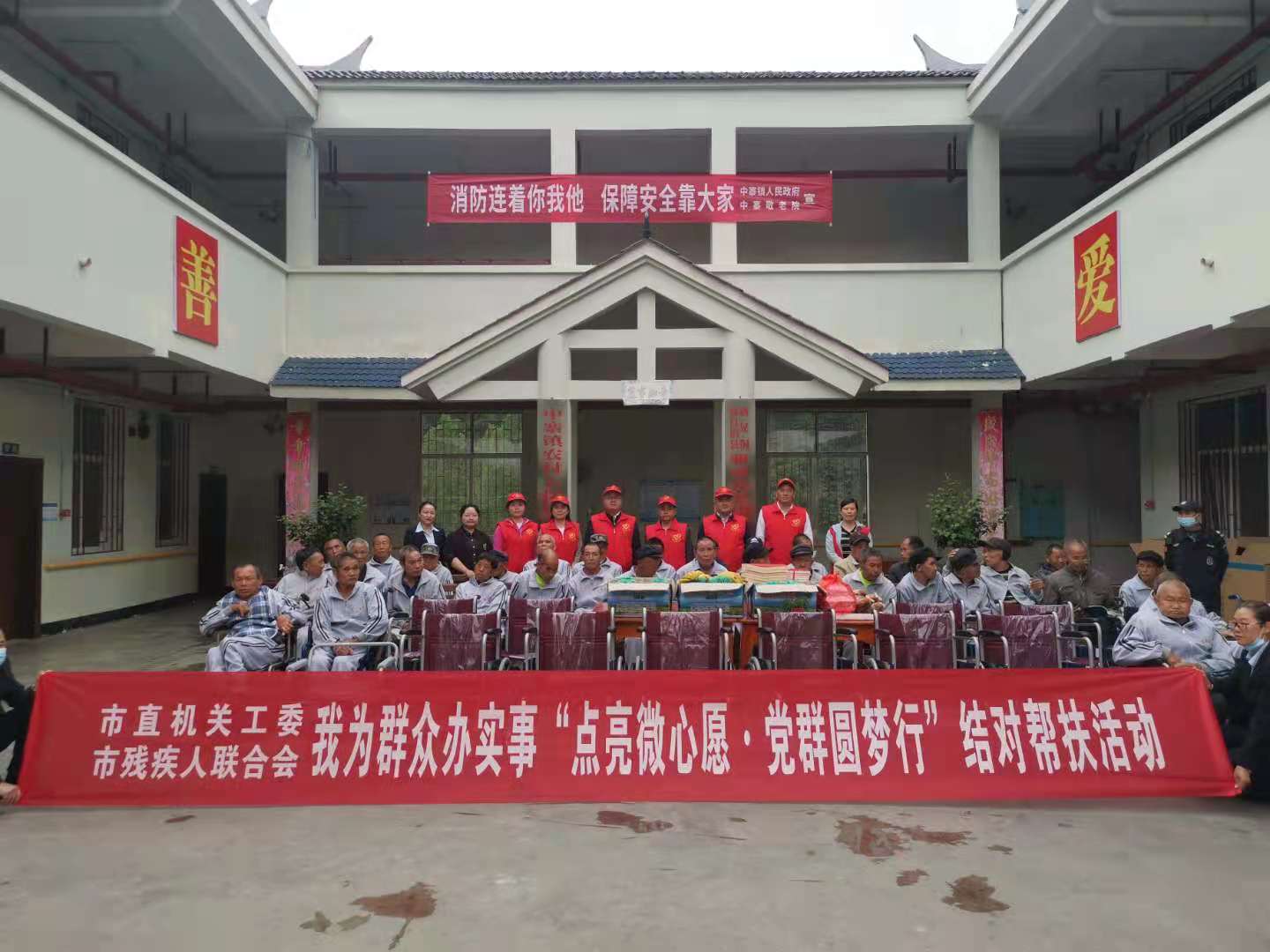 新晃县中寨镇,群山环绕,山清水秀,距县城20公里,与贵州省接壤。该镇农村低保供养服务中心,共供养53位老人,其中残疾人24名,急需轮椅、书籍等物资。了解到这一情况后,怀化市直机关工委立即行动,联合市残联,为该中心送去残疾人适配轮椅10台,《党史小故事》《毛泽东诗词》等书籍30册和一批爱心食物、水果,价值7000余元,并为该中心老人、残疾人播放红色经典电影《开国大典》。老人们像过节一样,院子里充满了欢声笑语。