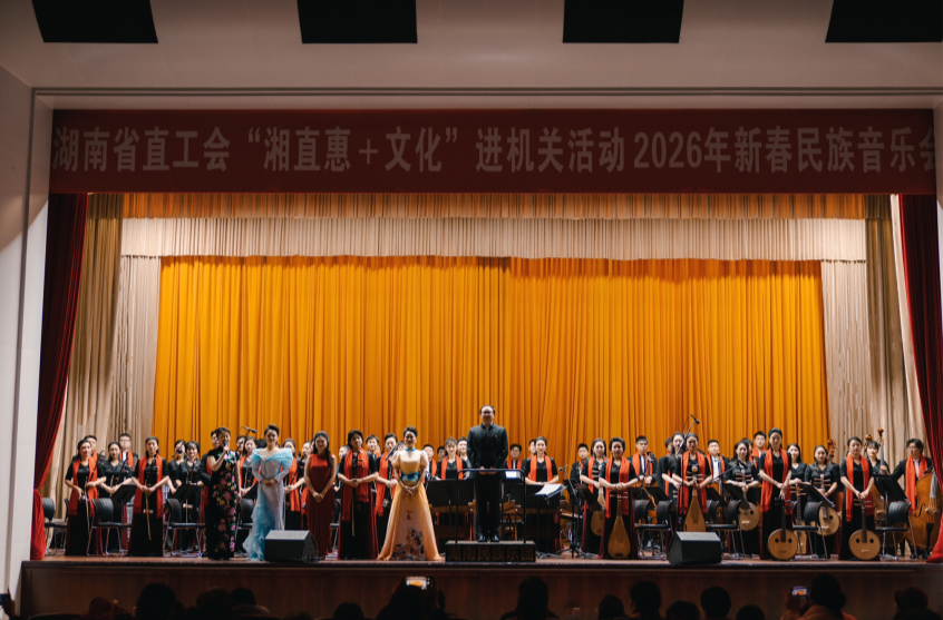湖南省直属机关工会委员会主办的“湘直惠+文化”进机关2026新春民族音乐会于1月22日晚成功举办,以民族音乐奏响新春序曲,凝聚奋进力量。音乐会节目丰富,包括《春节序曲》《水云山晓》等,展现湖湘山水之美与时代风貌。这是“湘直惠+文化”品牌活动实践,该品牌立足新时代思想推进精神文明建设,音乐会激励干部职工团结奋斗投身湖南建设发展实践。
