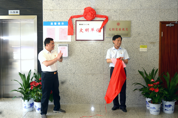 6月16日,省卫生健康委在机关一楼大厅举行“湖南省2020届文明单位”揭牌仪式,省直纪检监察工委书记肖华林、省卫生健康委党组成员、副主任祝益民共同揭牌。