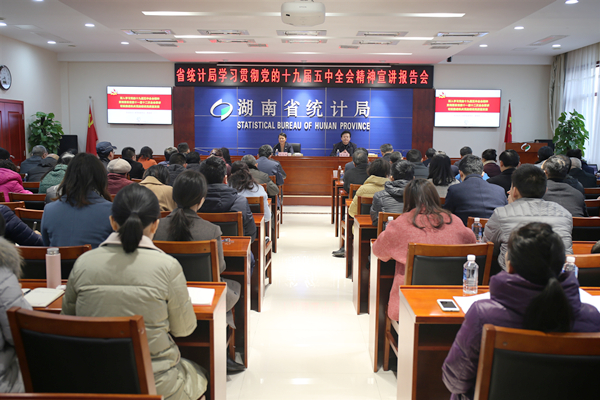 为深入学习贯彻党的十九届五中全会精神和省委十一届十二次全会精神,12月25日,省统计局举行学习贯彻党的十九届五中全会精神宣讲报告会。省委宣讲团成员、省直机关工委常务副书记龚凤祥作了题为《深入学习党的十九届五中全会精神,贯彻落实省委十一届十二次全会要求,切实推进机关党的建设高质量发展》的宣讲专题报告。局党组书记、局长刘文杰主持宣讲报告会,全体局领导,全局党员干部职工参加。