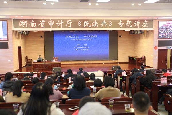 为不断提升审计干部的法治意识和法治素养,大力营造尊法学法守法用法氛围,近日,省审计厅召开党组理论学习中心组(扩大)2020年第11次集中学习,邀请省司法厅政治部队伍建设综合指导处处长、公职律师张政作《中华人民共和国民法典》专题讲座。厅党组书记、厅长胡章胜主持讲座,在家厅领导、厅机关全体党员干部参加讲座。