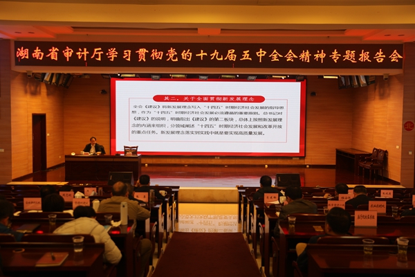 胡章胜强调,要进一步提高政治站位,抓好全会精神的学习宣传贯彻,推动我省审计事业高质量发展。一是要强化学习宣传,推动全会精神在我厅落地生效。将深入学习宣传全会精神作为全省审计机关当前和今后一个时期的首要政治任务,并与学习宣传习近平总书记考察湖南重要讲话精神和对审计工作系列重要指示精神结合起来,多形式、全覆盖开展学习宣传活动,推动全会精神入脑入心入行。二是要强化政治引领,牢牢把握新时代审计工作的正确前进方向。以习近平总书记重要讲话精神为指导,站在服务党和国家事业全局的高度,紧紧围绕贯彻落实全会部署的重点任务,以及省委、省政府工作中心,扎实开展审计监督,真正担负起在构建新发展格局中的职责和使命,推进我省经济社会高质量发展。三是要强化责任担当,充分发挥审计服务全省经济社会发展的重要作用。将学习宣传贯彻全会精神与当前审计工作结合起来,全面梳理年度审计项目任务,准确把握工作进度,倒排工期,把握节奏,全力以赴打好年底收官战,积极为实现“十四五”良好开局贡献审计力量。(省审计厅机关党委 欧阳亦周 供稿)