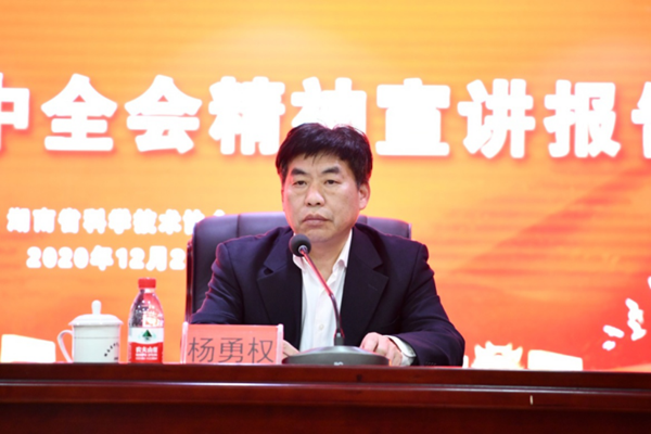 为深入学习领会习近平新时代中国特色社会主义思想,学习党的十九届五中全会精神以及习近平总书记在党的十九届五中全会上的系列重要讲话精神,12月2日下午,省科协党组理论学习中心组举行2020年第十一次(扩大)学习第二阶段集中学习,邀请省委宣讲团成员、省直机关工委一级巡视员杨勇权作党的十九届五中全会精神宣讲报告。省科协党组书记、副主席刘小明主持。
