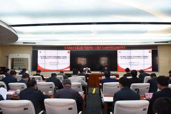 10月28日下午,省交通运输厅党组理论学习中心组举行2020年第九次集体学习,深入学习领会习近平总书记关于机构编制工作、加强和改进统一战线工作、禁毒工作的重要论述,学习习近平总书记在深圳经济特区建立40周年庆祝大会、在纪念中国人民志愿军抗美援朝出国作战70周年大会、在中共中央政治局第二十三次集体学习上的重要讲话以及中共中央办公厅《关于巩固深化“不忘初心、牢记使命”主题教育成果的意见》。厅党组书记、厅长赵平主持学习并作总结讲话,厅直各单位党委(总支、支部)书记、厅机关各党支部书记、厅工青妇组织负责人参加学习。