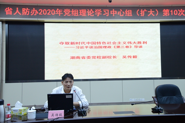 为全面系统学习《习近平谈治国理政第三卷》,推动读原著、学原文、悟原理,不断提高人防党员干部政治能力。9月25日,省人防办组织党组理论学习中心组举行第10次集中学习,邀请省委党校副校长、湖南行政学院副院长吴传毅作“夺取新时代中国特色社会主义伟大胜利--《习近平谈治国理政第三卷》导读”的辅导授课,机关和直属单位全体人员参加。
