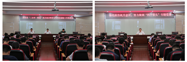 会议以专题党课的形式,以“强化政治机关意识,坚决做到‘四个带头’”为内容,从“旗帜鲜明讲政治,带头做到‘两个维护’;持之以恒抓学习,带头深化理论武装;牢记初心和使命,带头夯实基层基础;坚持改革再出发,带头推进正风肃纪”四个方面,结合推进“三表率一模范”机关建设与省文明单位创建工作作了安排部署。