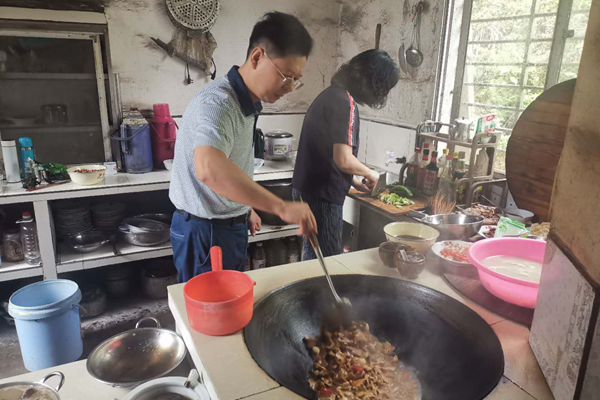 “老乡,今天我们来做饭,一人来个拿手菜,试试谁的手艺好。”快到中午了,帮扶人都忙开了,摘菜、洗菜、切菜、炒菜,烧火、铺桌、摆盘、打扫。帮扶人和贫困户情同一家人,共吃一餐饭,共谋致富路。