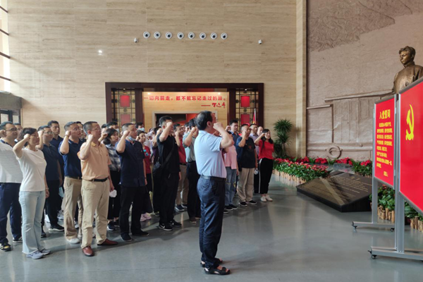 在中国共产党长沙历史馆大厅,全体党员在省委军民融合办常务副主任黄东红的带领下,举起右手,重温入党誓词:“我志愿加入中国共产党,拥护党的纲领,遵守党的章程,履行党员义务……”