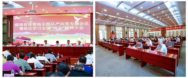 为深入学习贯彻习近平新时代中国特色社会主义思想,全面贯彻党的十九大精神和十九届中央纪委四次全会、省十一届纪委五次全会精神,部署安排湖南省体育系统2020年的全面从严治党和反腐败工作,学习贯彻全国“两会”精神,6月23日下午,湖南省体育局组织召开全面从严治党专题会议暨传达学习全国“两会”精神。省体育局全体局领导,机关全体干部,各直属党政负责人和老同志代表参加了会议。