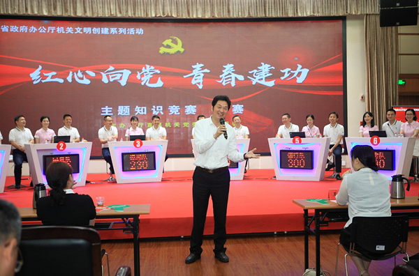 为持续强化理论武装,深学笃用习近平新时代中国特色社会主义思想,引导全厅青年干部传承“五四”精神,牢记使命勇担当,按照省政府办公厅机关党建工作要点安排,5月29日,省政府办公厅举办“红心向党 青春建功”主题知识竞赛决赛。省政府秘书长、办公厅党组书记王群,省政府副秘书长、办公厅主任陈仲伯,省委宣传部二级巡视员、省文明办副主任熊科文,省直工委委员杨立勇等领导出席。