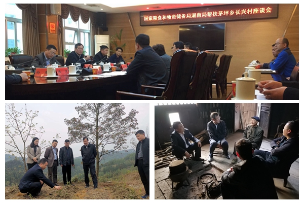 为深入贯彻习近平总书记在决战决胜脱贫攻坚座谈会上的重要讲话精神,有效落实湖南省委扶贫工作要求,4月7日至8日,国家粮食和物资储备局湖南局分党组书记、局长袁昌模带队到对口扶贫点——湘西州龙山县茅坪乡长兴村调研督战。调研组听取了驻村扶贫队工作汇报,与龙山县委主要负责同志进行座谈会商,深入扶贫村察看了茶叶基地及加工厂建设、农户中蜂和太空鸡养殖、村民饮水和道路等基础设施、美丽乡村建设情况,并走访看望了贫困户。湖南局分党组成员、副局长卢东风和局办公室、规划建设处负责人参加调研。