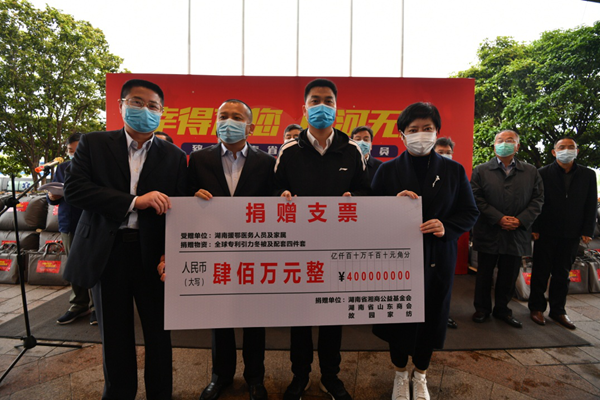 捐赠活动由省政协经济科技委员会主任吴金明主持,省政协常委、湖南省山东商会会长李涛代表捐赠方,向援鄂医务人员代表授捐赠牌,共向1498名医护人员捐赠了价值400万元的故园家纺床上用品。湖南援鄂医疗队领队蔡宏坤代表全体援鄂医护人员向此次爱心捐赠作致谢发言。