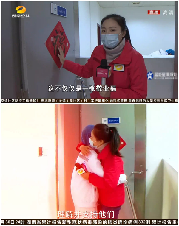 除夕当天晚上,她主动请缨,前往湘雅三医院发热门诊,因为就在前一天,湘雅三医院刚刚确诊了一例患者。在这种情况下,这位年轻的记者依旧没有退缩,她说:群众需要了解疫情,而让大家了解真实情况,及时最好防控,这就是一个记者责任所在。采访中,她了解到,由于医院防护服缺乏,为了节约一次性使用的防护服,医生护士们一天工作八个小时,忍住尽量不去厕所,甚至连水也不敢喝。报道一出,医务人员们的敬业精神,让很多观众感动,在抖音官方账号上浏览量达到了7000多万,点赞320多万。医务人员们在防控疫情一线的状态让很多人由衷敬佩,同时也在初期给大家打下了“预防针”。