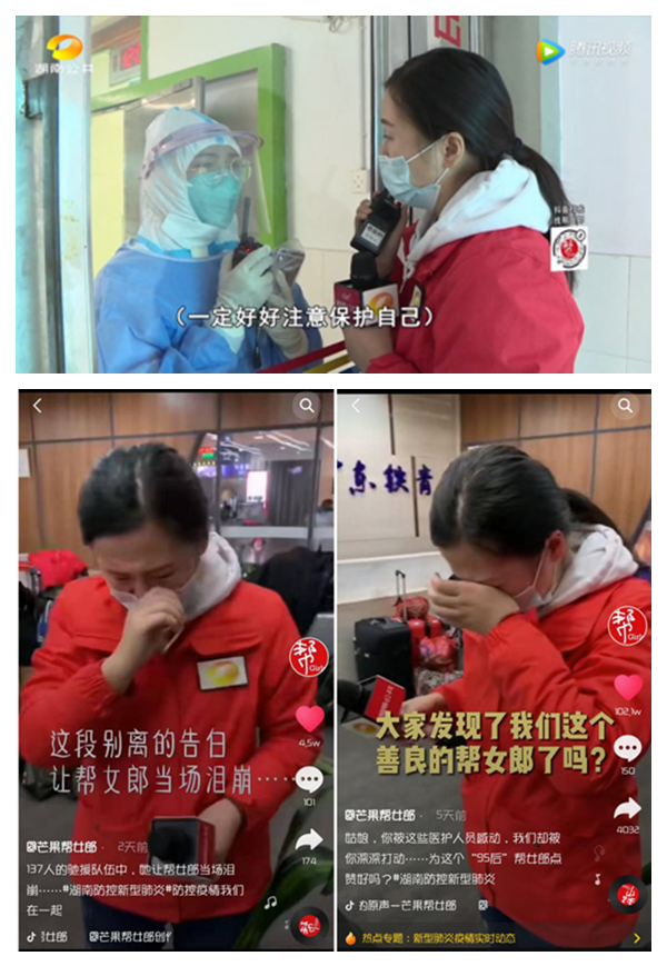 抖音短视频《为了争分夺秒,为了特殊时期哪怕不浪费一件防护服,他们连水都不敢喝》,播放量7870万 点赞数 332.5万,评论14.4万;短视频《请为包括帮女郎在内的更多“疫战”一线的女孩》,播放量1230万,点赞数102万;《天价口罩,遇到请举报!》,播放量4250.7万,点赞数179.2万;