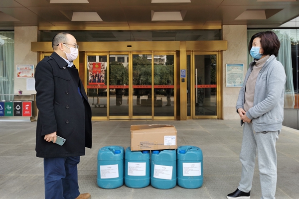 2月20日下午,民革湖南省委向省社院捐赠一批疫情防控物资,包括一次性口罩500个,84消毒液4桶。学院副院长、党组成员彭英代表院方接收捐赠物资。