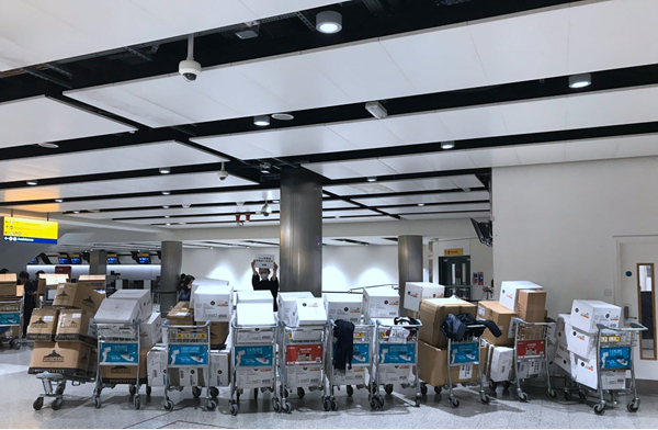 图:海外捐赠人将52个包装箱1821件防护服送达希斯罗机场