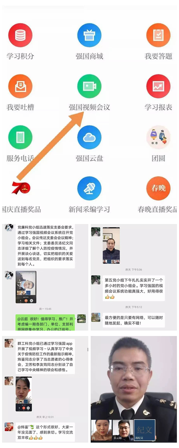 为减少人员聚集带来的疫情传播风险,落实中央在防疫工作期间“少开会,开短会”的要求,充分运用“学习强国”平台推出的视频会议功能,政工办党支部组织各党小组采用视频会议形式召开党小组会,进行专题学习讨论,落实支委会提出的措施。