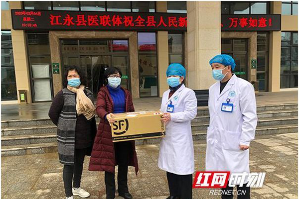 图:2月4日,江永县台办相关人员将30名江永籍陆配捐赠的医用防护服送到县人民医院