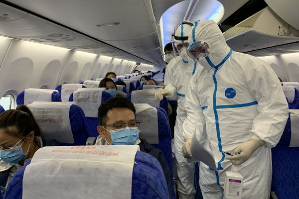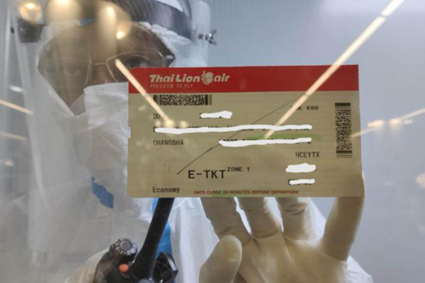 长沙黄花机场海关关员登机对重点旅客进行流行病学调查
