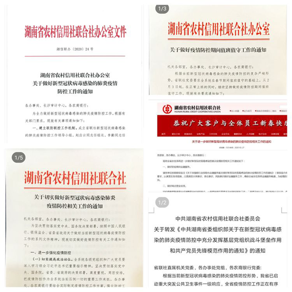 二是强化制度管理。为进一步加强对全省农信系统疫情防疫工作的安排部署,省农信联社分别下发了《关于做好新型冠状病毒感染的肺炎疫情防控工作的通知》《关于进一步做好新型冠状病毒感染的肺炎疫情防控相关工作的通知》《关于加强信贷服务助力打赢新型冠状病毒阻击战的通知》等一系列文件制度,要求全系统严格落实领导在岗带班和24小时值机制度,确保人员到位、信息畅通;辖内农商银行加强与各地党政等有关部门信息沟通,及时了解、全面满足疫情防控金融需求,合理调剂工作人员、安排营业时间,切实保障疫情防控工作与基本金融服务稳步推进。