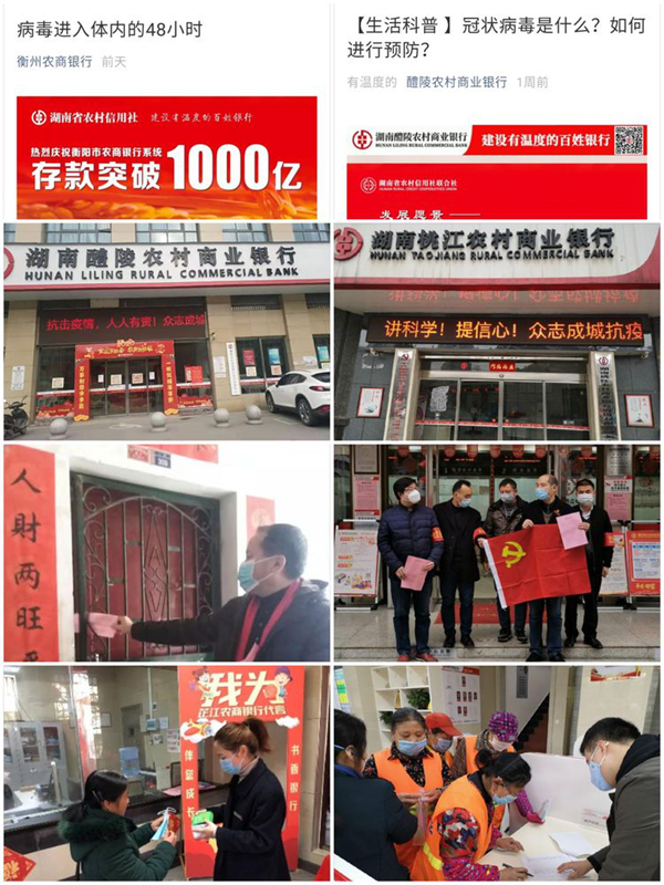 3.多措并举,助力疫情防控工作。各农商银行充分发挥点多面广的优势,利用微信公众平台、LED显示屏、设点摆摊等进行疫情防控知识宣传,让广大民众对此次疫情有更深认识。在得知许多药店口罩早已售空,大量居民根本没办法及时买到符合标准的防护口罩时,部分农商银行想尽办法采购口罩、酒精等防护物资,为居民免费发放,得到了广大客户纷纷称赞。