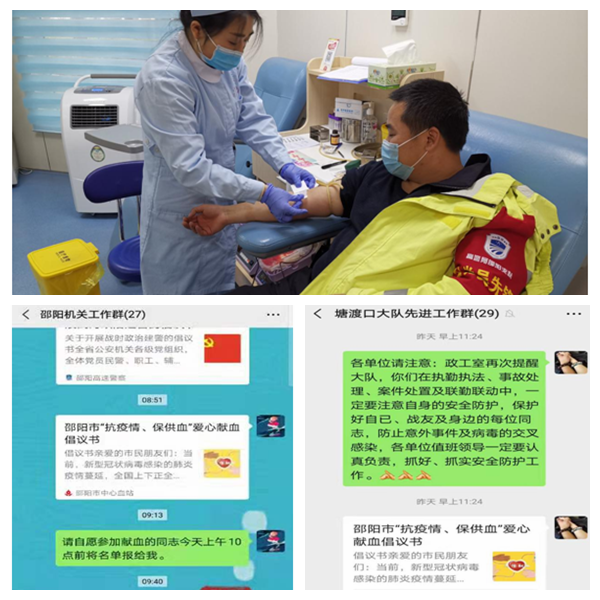 近日,邵阳中心血站因受疫情影响采血形势严峻,血源告急,高警局邵阳支队党委立即响应号召,深入防疫一线,配合卫健部门排查人员和车辆,开展防疫宣传,保障防疫物资运输通畅,同时,组织党员民警就近献血,奉献大爱,为输血患者带来生命的希望。
