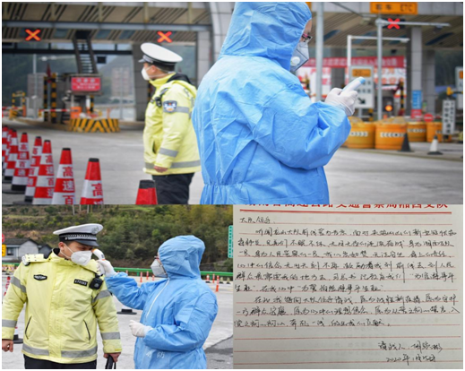 医警夫妻在一线相遇,不同的“战场”,一样的坚守。胡家彬是高警局湘西支队永顺大队综合中队的一名民警,妻子黄丹是灵溪镇卫生院一名护士。在这特殊时期,他们夫妻两人都在永顺收费站的疫情检查站,坚守在阻击疫情一线,夫妻两人同心协力,相互照应,在这疫情面前也添了一份温馨。除夕当晚,胡家彬在得知了湘西北一线需要支援的情况下,他毅然自愿请战去支援龙山大队,去更需要他的地方。“我只想尽最大的努力,做最有意义的事,哪怕是很微薄的力量,我也要去做。”朴实的语言表达了他坚定的信念,国家在前,小家在后。在妻子得知他要去往龙山大队支援时,尽管不舍,仍然支持,她说到“不管在哪里,身为警医的我们,哪里更需要,就往哪里去。待到山花烂漫时,我们再相聚。”