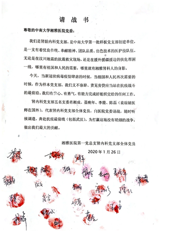 “当前,疫情肆虐,祖国和人民再次需要的时候,我们义不容辞、责无旁贷,应当站在抗疫战斗的最前沿。”1月25日,中南大学湘雅医院第一党总支肾内科党支部向医院党委提交请战书。请战书落款处,是该支部全体24名党员的签名和手印。从这天开始,一个个党支部纷纷向湘雅医院党委提交请战书。