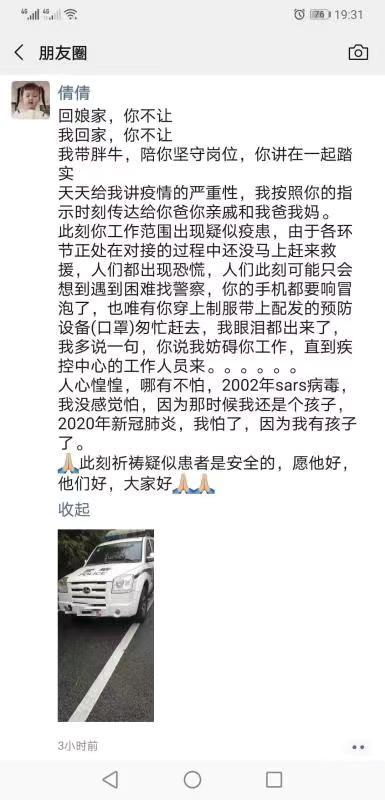 吕倩追问下,周杨瞒不过去:“没事,我戴着口罩呢。我不直接接触,不需要医院级别的防护,安全着呢。疫情在前,警察不退,何况我还是党员。”妻子吕倩心生担忧,默默发了这样的朋友圈,愿“他好,他们好,大家好。”