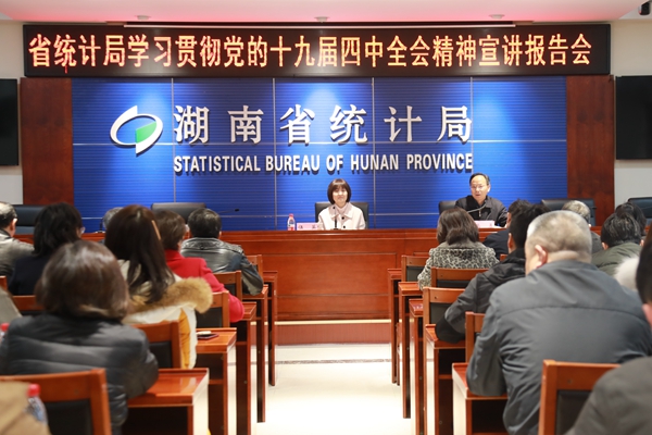12月17日下午,省统计局举行学习贯彻党的十九届四中全会精神宣讲报告会。省委宣讲团成员、省直机关工委副书记伍英作宣讲报告。省统计局党组成员、副局长、机关党委书记高勇主持报告会。局党组成员、副局长李绍文,局党组成员、总统计师戴乐平,局党组成员、总经济师颜宏晖,局副巡视员曾斌求、张昭红出席会议。