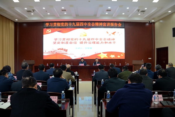 12月16日下午,省工信厅举行学习贯彻党的十九届四中全会精神宣讲报告会,报告会由厅党组副书记、副厅长李志坚同志主持,厅机关全体党员及厅属单位负责同志140余人参加报告会。省委宣讲团成员,省人大常委会委员,湖南省社科联党组书记、常务副主席宋智富作了题为《学习贯彻党的十九届四中全会精神 坚定制度自信、提升治理能力和水平》的专题宣讲报告。