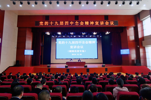 赵应云指出,宣讲报告站位很高、阐述深刻,具有很强的理论性与指导性,是对我们学习领会、贯彻落实会议精神的一次精彩辅导。党的十九届四中全会是在新中国成立70周年之际、在“两个一百年”奋斗目标历史交汇点上召开的一次具有里程碑意义的重要会议。全系统要深化思想认识,提高政治站位,深入学习宣传贯彻党的十九届四中全会精神,切实把思想和行动高度统一到全会精神上来。要抓好学习宣传、确保入脑入心,把学习宣传党的十九届四中全会精神,作为当前和今后一个时期的重要政治任务,推动全系统上下兴起学习宣传贯彻全会精神热潮。要紧扣工作重点,积极回归本源,坚持以全会精神为指引,扎实、深入、持久开展“党建共创、金融普惠”行动,以扎实过硬的工作成绩和工作作风,展现湖南农信系统贯彻全会精神的实际成效。