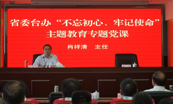 7月31日,省委台办召开“不忘初心、牢记使命”主题教育大会,肖祥清主任以《坚持问题导向,主动担当作为,为推进祖国和平统一进程作出湖南贡献》为题为全体党员干部职工讲专题党课,傅雷副主任主持,省委巡回指导第十二组李苍松处长出席。