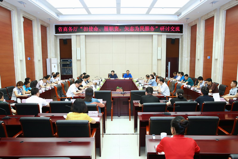 7月22日下午,省商务厅党组理论学习中心组围绕“担使命、履职责,矢志为民服务”开展第二次主题研讨交流。省委第三巡回指导组组长常智余出席指导,厅党组书记、厅长徐湘平主持会议, 在家厅领导和省商务服务中心、机关处室主要负责人参会。