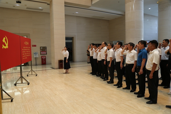 在陈列馆大厅,全体参加人员整齐列队,面对“潇湘魂”革命主题塑像,在鲜艳的党旗下,紧握右拳重温入党誓词,再次感受到作为党员的光荣、使命与责任,表达“不忘初心、牢记使命”的坚定信念。
