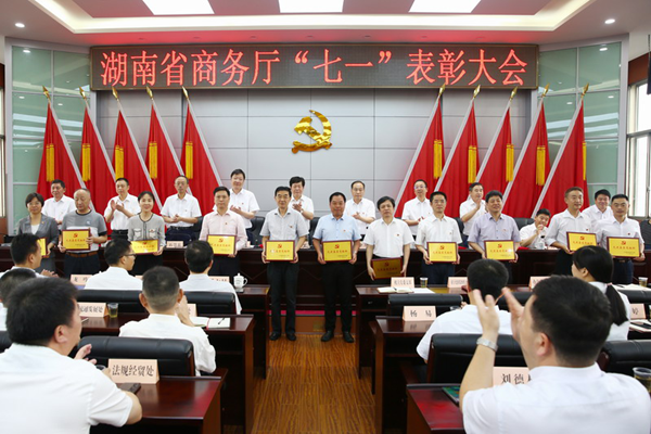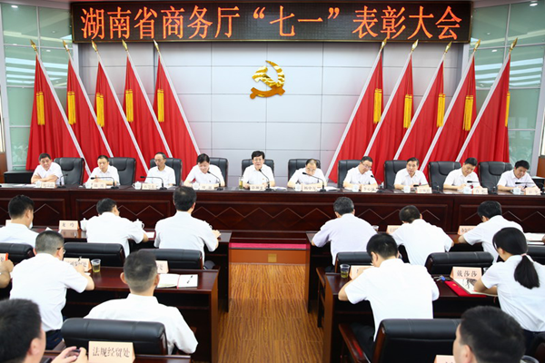 7月9日上午,省商务厅召开直属系统“七一”表彰大会,在家厅领导,驻厅纪检监察组、厅机关各处室(中心)、商务服务中心全体党员,厅直属单位主要负责人及获得表彰的“两优一先”代表参加会议。厅党组书记、厅长徐湘平同志出席大会并讲话。