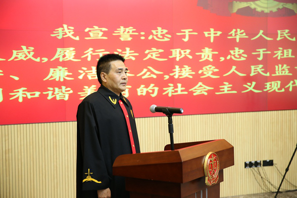 宣誓台前,领誓人手抚《中华人民共和国宪法》,15名同志面向国徽,右手举拳,许下铮铮誓言:“我宣誓,忠于中华人民共和国宪法,维护宪法权威,履行法定职责,忠于祖国、忠于人民,恪尽职守、廉洁奉公,接受人民监督,为建设富强民主文明和谐美丽的社会主义现代化强国努力奋斗!”
