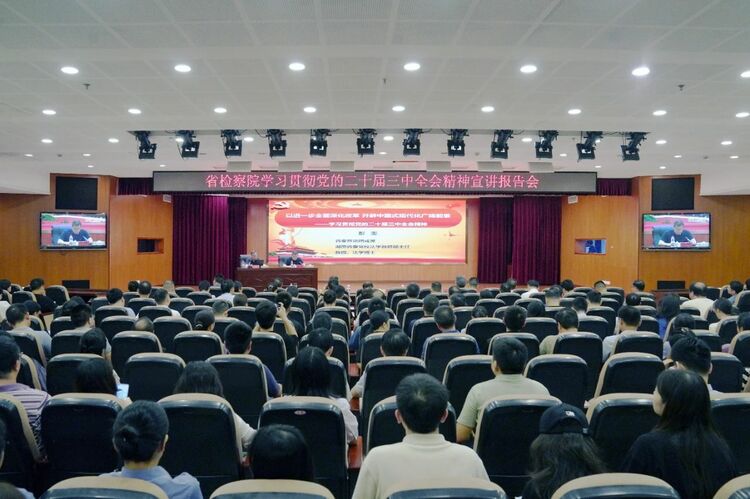 彭澎教授围绕“进一步全面深化改革 开辟中国式现代化广阔前景”的主题,从深刻把握全会召开的重要背景和重大意义、深入领会全会的重要思想和总体要求、全面理解全会提出的深化改革重大举措、全力以赴抓好全会精神贯彻落实四个方面对全会精神进行了系统全面的宣讲和解读,为检察机关党员干警深刻学习领会全会精神,准确把握进一步全面深化改革、推进中国式现代化的重大意义和实践要求,扎实抓好各项任务贯彻落实提供了有益指导。会议强调,要进一步加深对全会精神的学习、理解、把握,自觉把思想和行动统一到全会精神上来,自觉聚焦进一步全面深化改革的总目标、思考谋划检察改革,自觉以检察担当保障党中央改革决策部署在湖南落实落地,自觉为完善中国特色社会主义法治体系贡献检察智慧和检察力量。