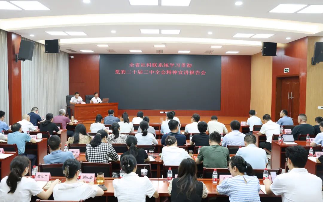 胡代松从深入学习领会习近平总书记在党的二十届三中全会上的重要讲话精神,全面准确理解《决定》提出的进一步全面深化改革重大举措,全力以赴抓好全会精神贯彻落实三个方面进行了系统阐述和深入解读。他强调,全省社科联系统要把学习宣传贯彻党的二十届三中全会精神作为当前和今后一个时期的重大政治任务,切实把思想和行动统一到党中央关于进一步全面深化改革、推进中国式现代化的决策部署上来,以钉钉子精神推动改革部署精准落地、取得实效。