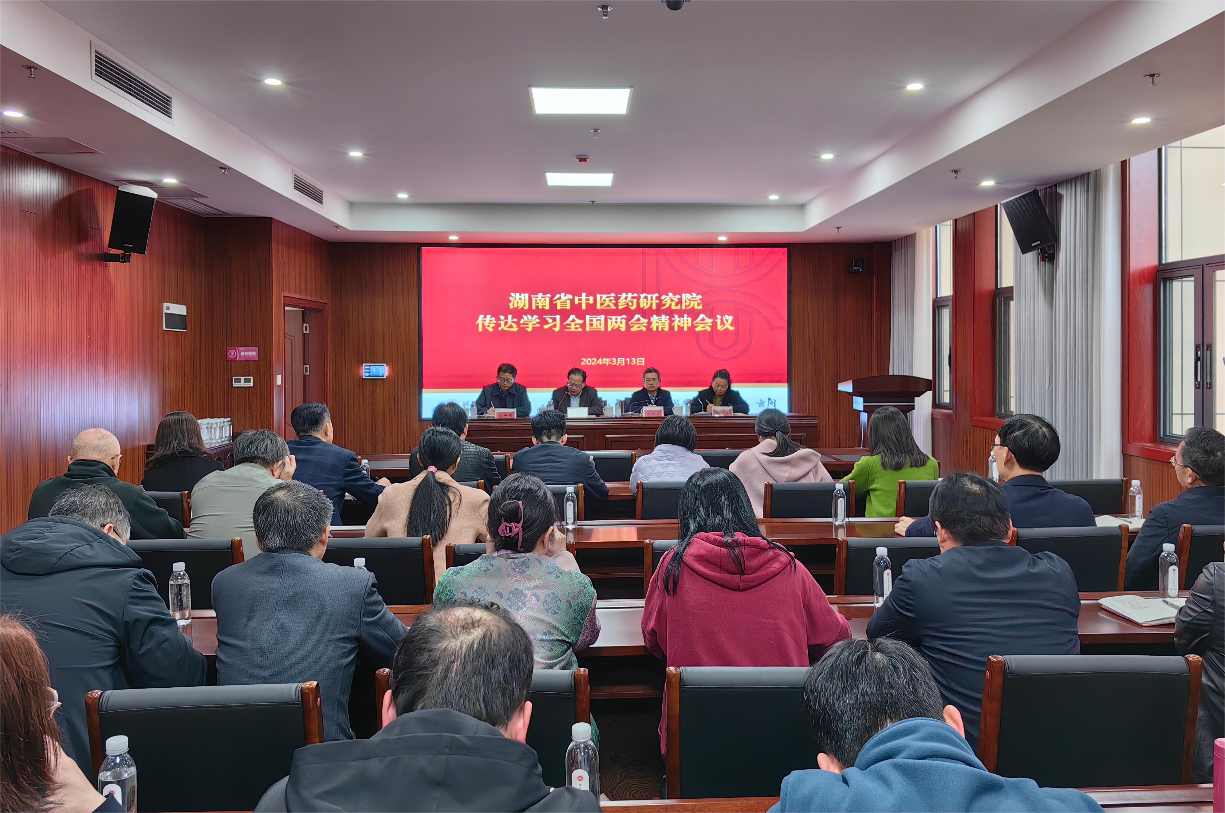 会议要求,要旗帜鲜明讲政治、顾大局。研究院各级各部门要把学习全国两会精神作为当前重要的政治任务,深刻领悟“两个确立”的决定性意义、做到“两个维护”,把学习宣传贯彻全国两会精神与贯彻落实党的二十大精神、习近平总书记关于中医药工作的重要论述紧密结合起来,与贯彻落实省委省政府工作要求紧密结合起来,与推动研究院高质量发展的实践要求结合起来,进一步把准方向、找准着力点,统一思想认识、坚定信心决心、凝聚奋进力量,全力以赴完成“高质量发展年”各项目标任务。要战略坚定谋发展、创标杆。因地制宜发展新质生产力,准确把握其内涵和特点,结合研究院实际,持续深化“5+1”核心竞争力新格局,把中药资源优势、创新药物开发、模式动物研究、药膳食疗研究等转化为生产力,全力打造中部地区中医药科技创新龙头;结合县域医疗卫生资源,全力将双峰县中医医院打造为紧密型县域医共体“双峰样板”,为建设健康湖南贡献研究院智慧。要心气齐顺抓项目、谱新篇。坚持上下“一条心”、全院“一盘棋”,进一步解放思想、深入调研、征求意见,充分发挥绩效考核和职称晋升两个“指挥棒”作用,过“紧日子”、打“细算盘”,提质降本增效,力戒形式主义、官僚主义,进一步激发研究院干部职工干事创业、担当作为的热情和活力,为实现“三高四新”美好蓝图、助力国家中医药综合改革示范区建设贡献研究院力量。