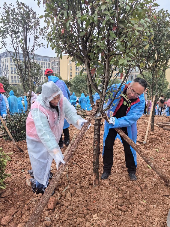 正值雨季,阴雨蒙蒙,但大家热情高涨,披着雨衣,手握锄头铁锹,两三人一组,有扶苗填土的、有支撑加固的,有拎水浇灌的......大家分工协作,井然有序,脸上洋溢着满满的成就感和喜悦之情。经过1小时的辛勤劳动,一棵棵树苗稳稳当当扎根进土壤里,等待它们的将是茁壮成长,枝繁叶茂......