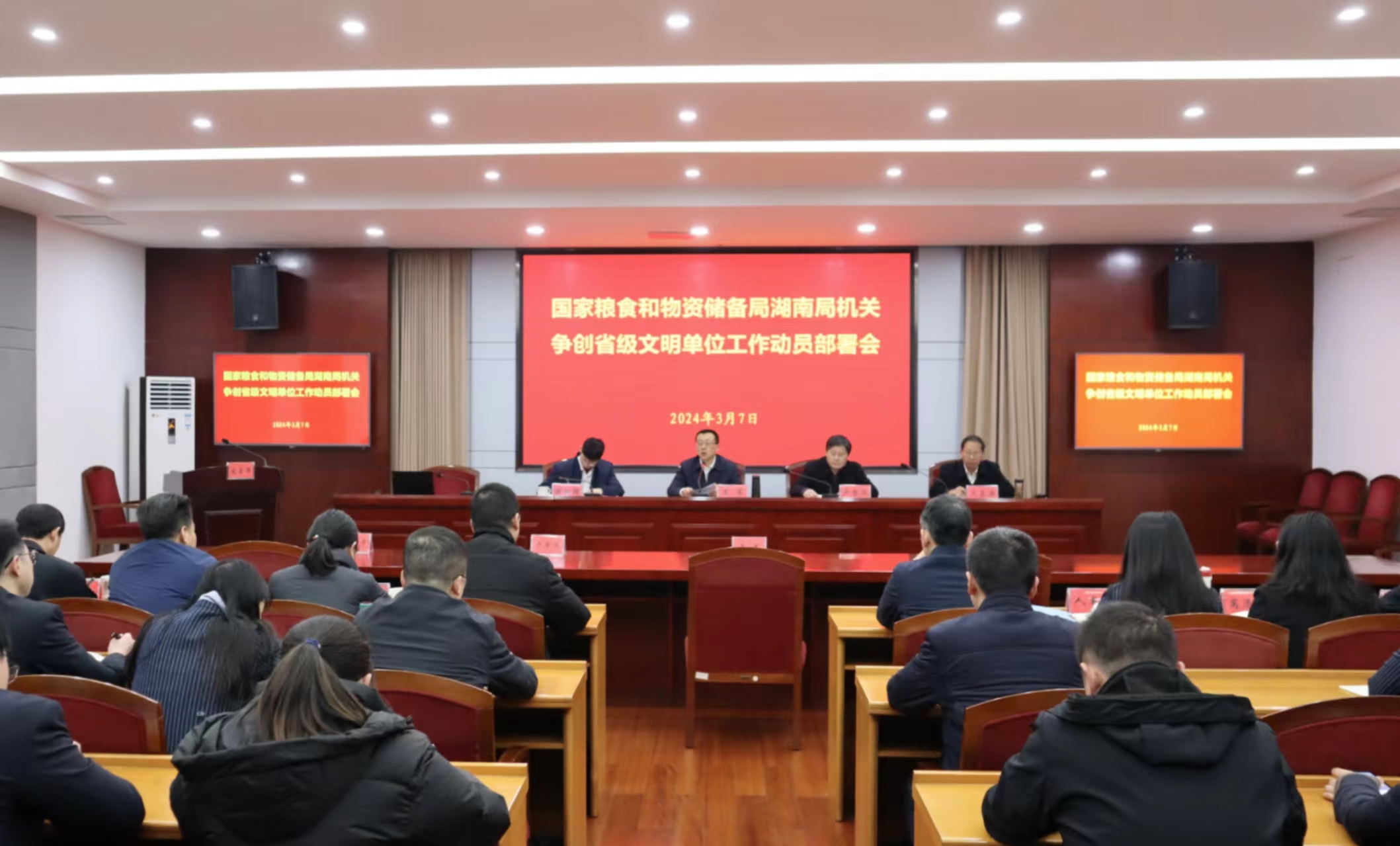 3月7日,国家粮食和物资储备局湖南局召开文明单位创建工作动员会暨工会会员大会。局分党组书记、局长王军出席并讲话,局分党组成员、纪检组长温朝晖主持会议,局领导、服务中心和机关全体干部参加会议。