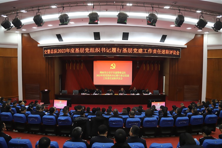 为深入学习贯彻习近平新时代中国特色社会主义思想,认真贯彻落实新时代党的建设总要求,紧紧抓住总队及直属系统基层党建工作这一主线,压紧压实各级党组织特别是党组织书记从严管党治警政治责任,推动总队各级党组织基层党建工作全面进步、全面过硬,2月27日,交警总队召开2023年度基层党组织书记履行基层党建工作责任述职评议会。交警总队党委书记、总队长蒋建湘出席会议并作点评讲话,交警总队党委副书记、政委吴冰主持会议,在家的总队党委班子成员出席会议。总队机关、高警局机关全体党员民警、职工,各高速交警支队党委书记和基层党员代表参会。