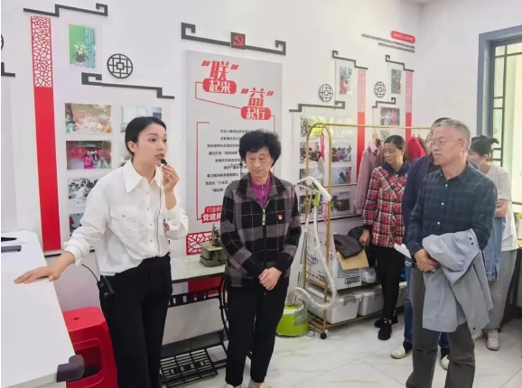 王家垅社区党委副书记钟翠(左一)现场解说社区“共享系列”服务。