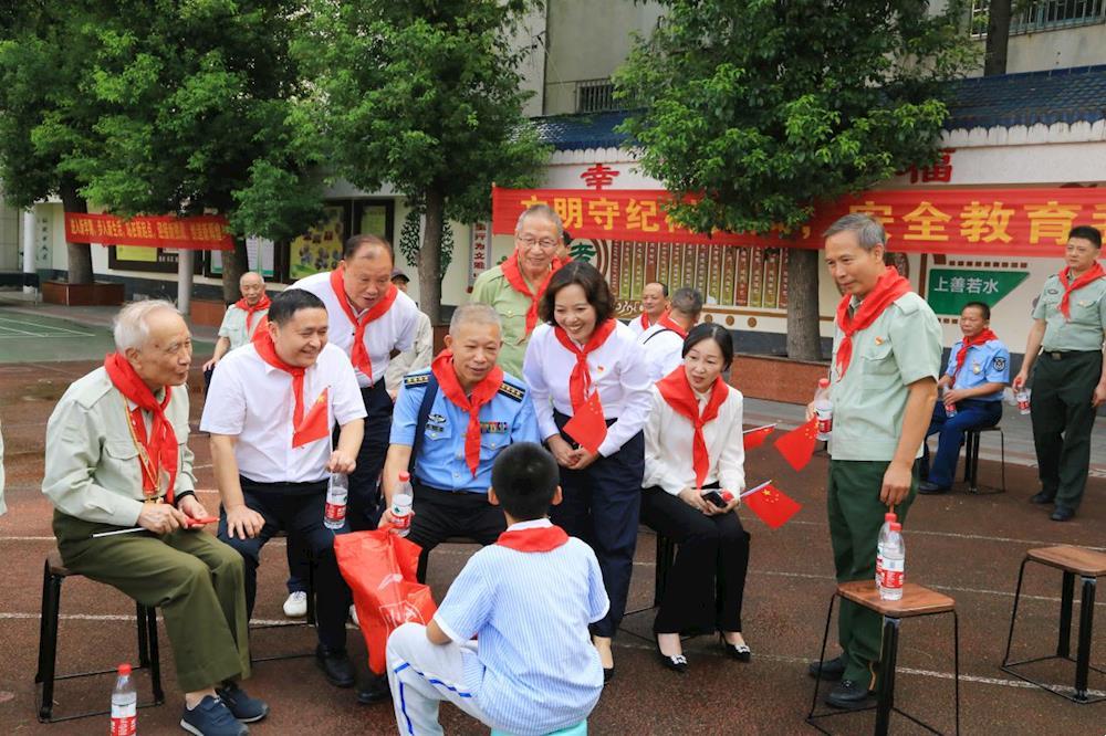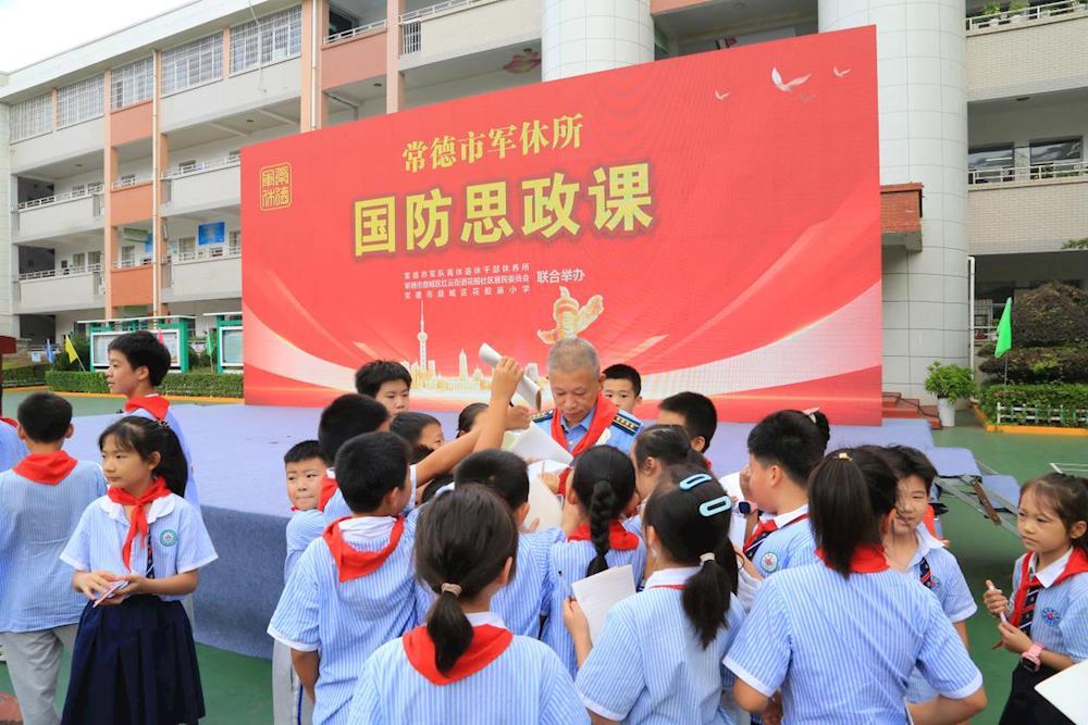 9月14日上午,常德市军休所“童心向党 强国有我”国防思政课走进鼎城区花船庙小学,主持人通过讲故事、互动交流的方式将军休干部代表刘铁真、贺先觉、王泽春、陈杰等人的军旅生涯融入国防思政课堂,给同学们带来了一堂别开生面的爱国主义教育之旅。