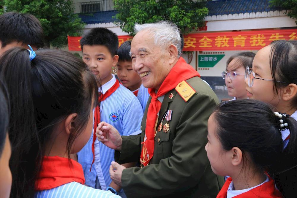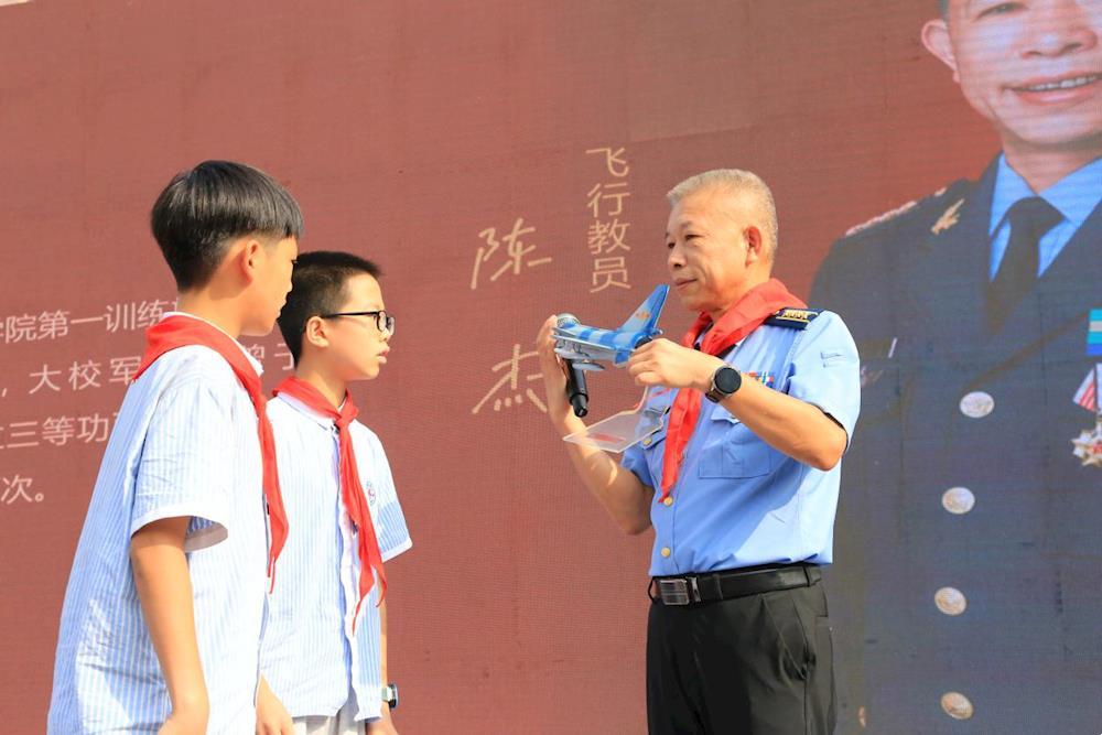 活动接近尾声,同学们挥舞着手中的小红旗,高唱《中国少年先锋队队歌》,整个现场成为一片沸腾的海洋。活动结束后,五年级的刘承坤来到军休干部身边,询问他感兴趣的军事问题。刘同学从小就是一个军事迷,听完国防思政课后,小小年纪的他立下了“长大我要开最先进的战斗机”的志向。“一个是未来,一个是榜样”这次活动成为他们人生最初的崇拜。理想的种子一经种下,一定会生根发芽。