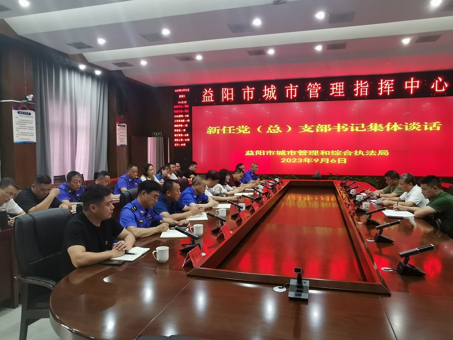 为进一步压实管党治党政治责任,9月6日,益阳市城管执法局组织开展新任党(总)支部书记集体谈话活动,局党组书记、局长张靖华与19名2023年新任党(总)支部书记进行集中谈话,局党组成员、副局长、机关党委书记李友松主持会议。