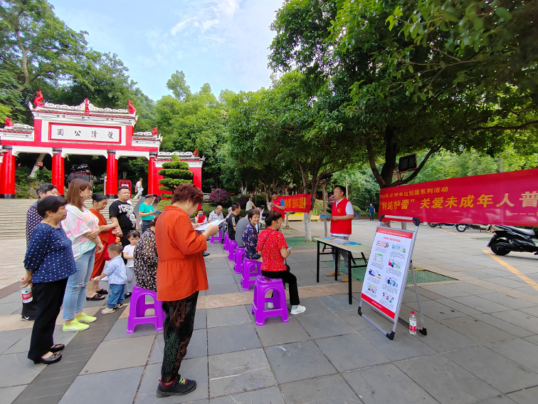 活动在社区旁边的双清公园广场举行,现场悬挂了宣传横幅,布置了活动展板,吸引了大量的群众驻足观看。志愿者宣讲了《中华人民共和国未成年人保护法》和未成人保护安全知识等内容,现场解答群众提出的“小孩经常上网怎么办”“小孩隐私怎么保护”等问题,还分别深入到群众活动场地发放宣传资料110多份。