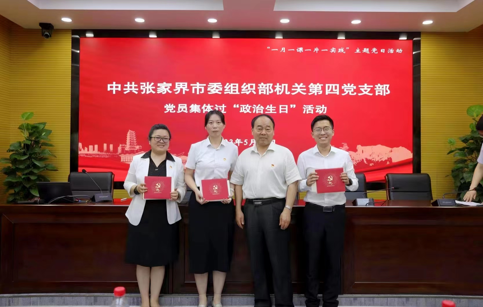 根据张家界市委组织部《关于党员集体过“政治生日”活动实施方案》要求,5月19日,张家界市委组织部机关第四党支部结合“一月一课一片一实践”要求,开展“永恒的誓言”主题党日活动,为3名同志集体过“政治生日”。通过集体忆初心、分享入党感悟、送上生日祝福等方式,引导党员进一步淬炼党性修养、砥砺初心使命。机关第四党支部全体党员、其他支部党员代表共35人参加活动。