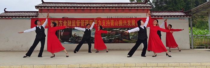 会后,青山村村民们自发举行答谢文艺演出,村支两委为上一轮驻村帮扶工作队赠送锦旗。